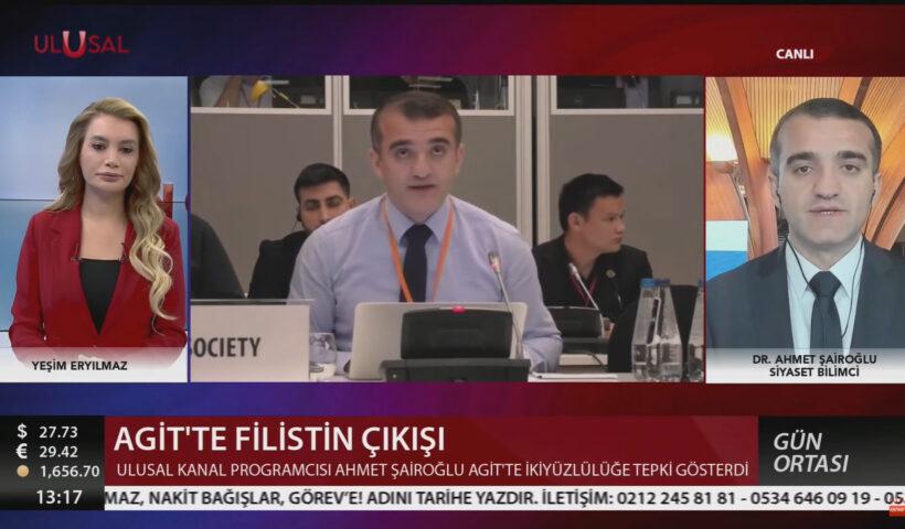 Ulusal Kanal`a konuşan Dr. Ahmet Şairoğlu AGİT`te Filistin`e destek konuşmasının detaylarını anlattı … Ulusal Kanal`a konuşan Dr. Ahmet Şairoğlu AGİT`te Filistin`e destek konuşmasının detaylarını anlattı