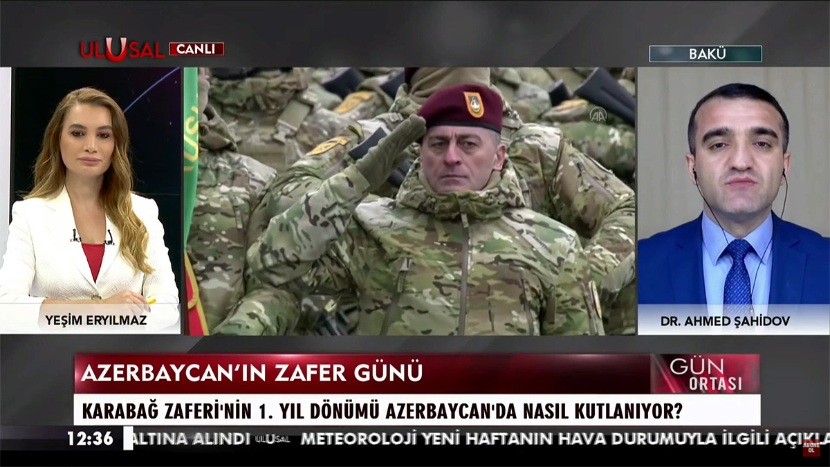 Bununla bağlı Türkiyənin Ulusal Kanal Televiziyasında çıxış edən siyasi şərhçi Əhməd Şahidov 44 günlük İkinci Qarabağ Müharibəsinin gedişi və əldə edilən böyük qələbə barədə danışıb.