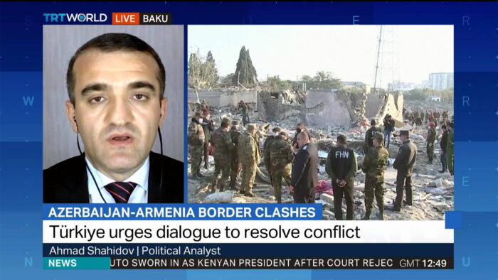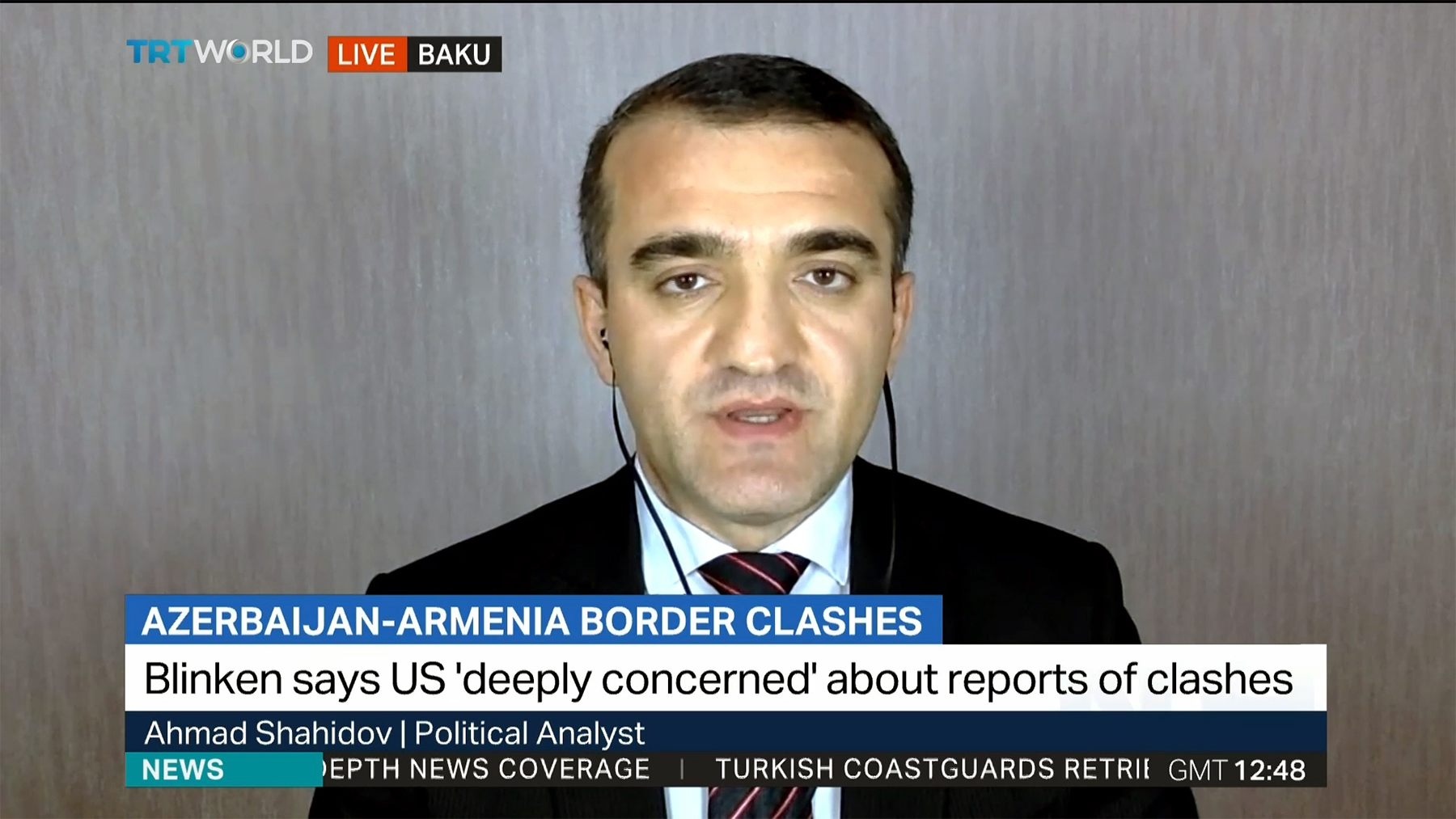 TRT World Televizyonu’na konuşan siyasi analist Dr. Ahmet Şahidov, bölgedeki gerginliğe ilişkin değerlendirmede bulundu: “Asıl mesele Azerbaycan sınırlarının güvenliğinin korunması ile ilgili. Ermenistan sınırında tampon bölge oluşturulması gündemde olan bir konu. Çünkü bu tür provokasyonlar sonsuza kadar süremez. Azerbaycan devleti, ordusunun ve sivillerin güvenliğini korumak için gerekli tüm adımları atmaktadır ve atmaya da devam edecektir.”