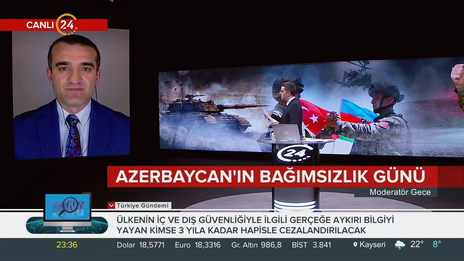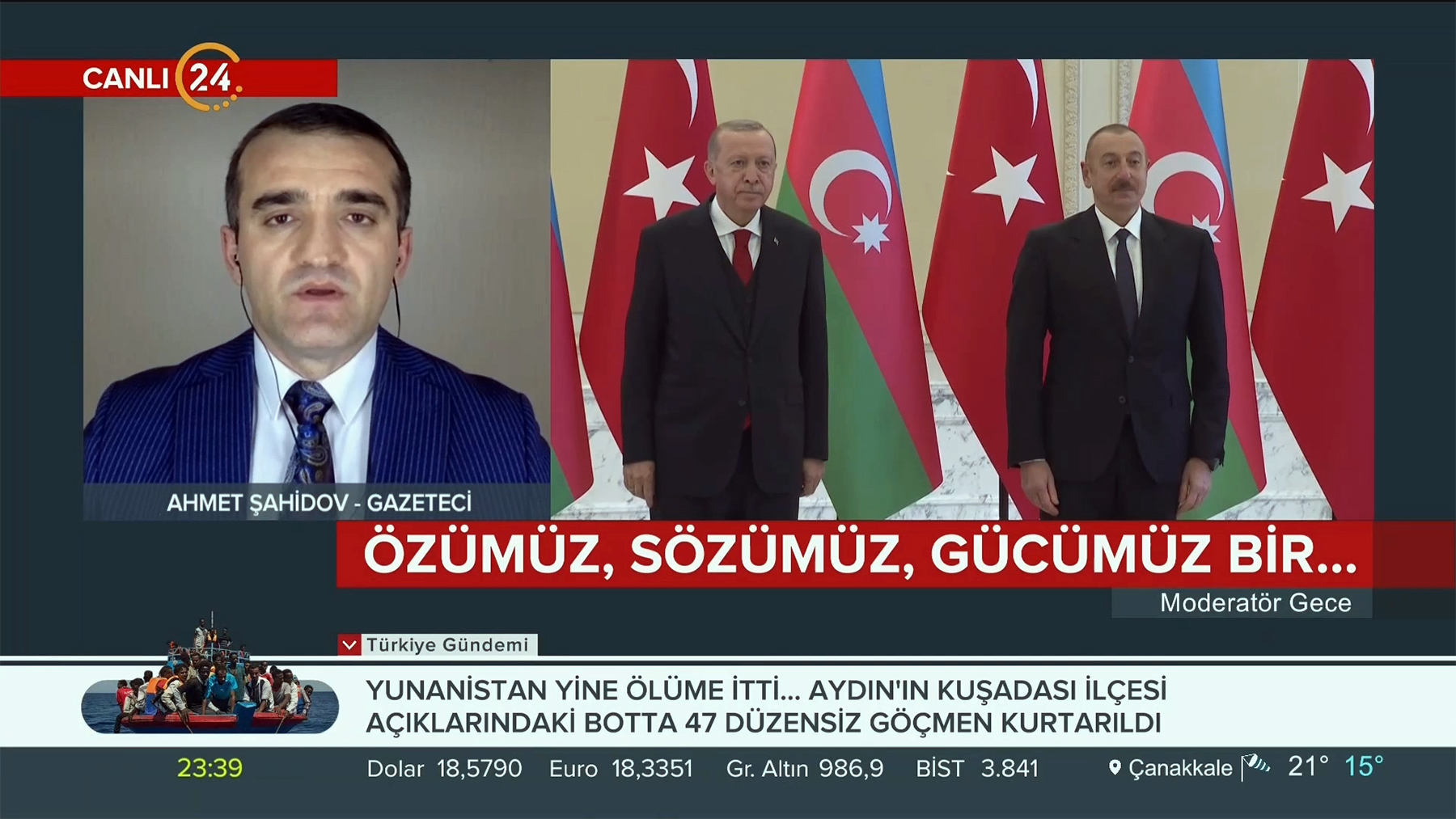 Kanal 24’ün “Moderatör Gece” programına konuşan uluslararası ilişkiler uzmanı Dr. Ahmet Şahidov, Azerbaycan’ın Bağımsızlık Günü ve Türkiye-Azerbaycan ilişkilerini anlattı ve gazeteci Erkan Kol’un sorularını yanıtladı.