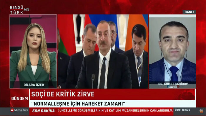 Konuyla ilgili BengüTürk kanalına konuşan siyaset bilimci Dr. Ahmet Şahidov, Soçi’de gerçekleşen Putin-Aliyev-Paşinyan görüşmesinden ciddi bir sonuç beklemeye gerek olmadığını belirterek, “Çünkü bu görüşme sadece Rusya’nın bölgedeki etki mekanizmasını sürdürme amaçlıdır ve ABD ve Avrupa’ya bir cevaptır.