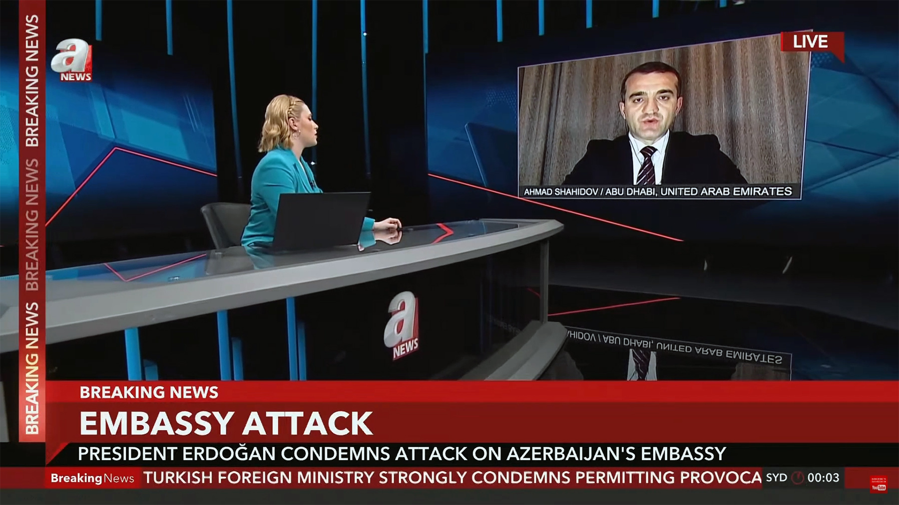Konuyla ilgili ANews kanalına konuşan siyaset bilimci Dr. Ahmet Şahidov, bu terör olayının sorumluluğunun İran devletine ait olduğunu belirterek, “Bu apaçık bir terör eylemidir ve kınanmalıdır. İran devleti olayı soruşturmazsa, sponsorları ortaya çıkarmazsa İran’ın bu terörizm suçunda ortak olması şüphesi artacaktır. Çünkü Azerbaycan büyükelçiliğine yönelik silahlı saldırının tüm sorumluluğu İran devletine aittir” dedi.