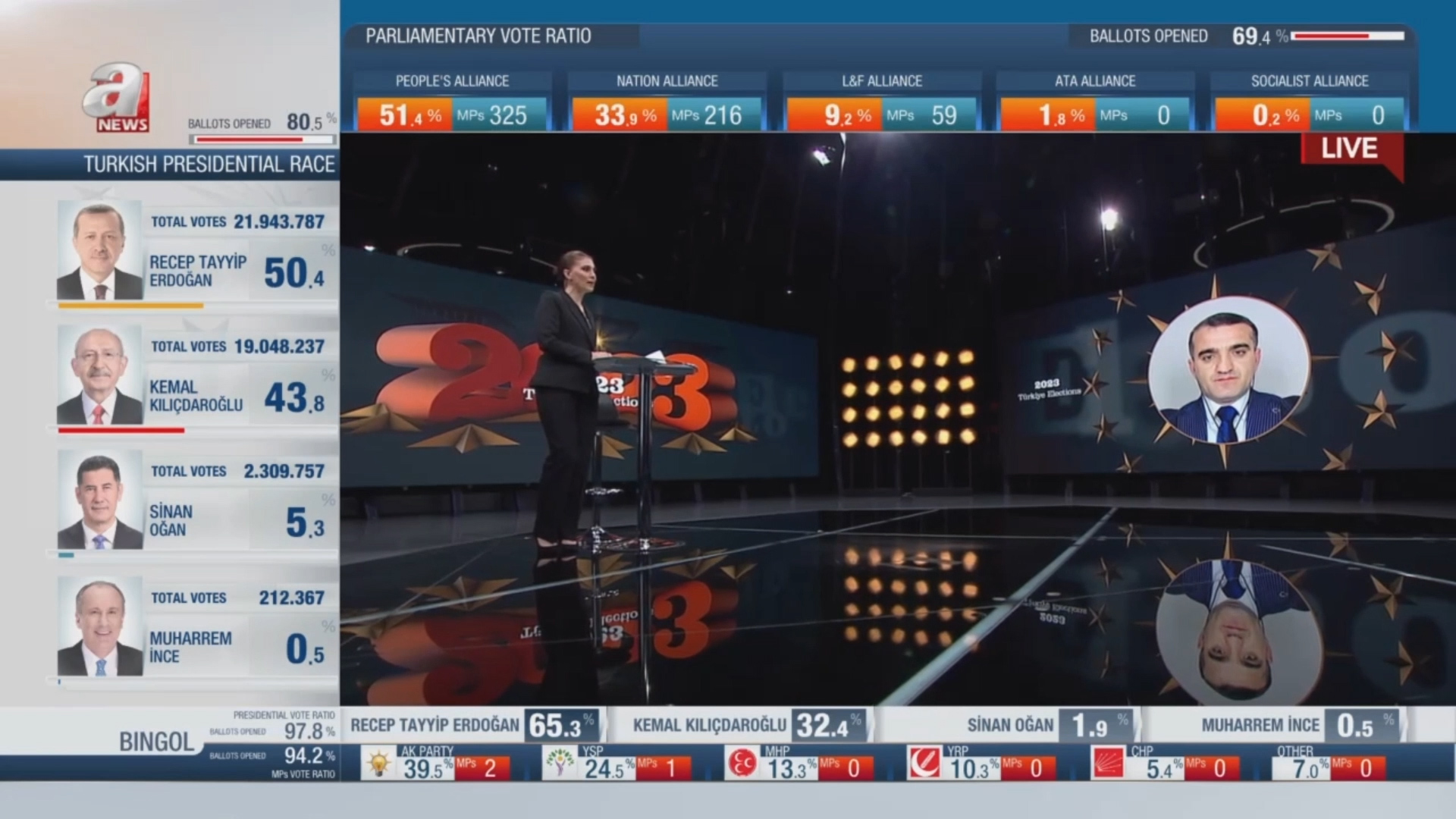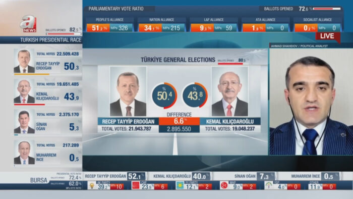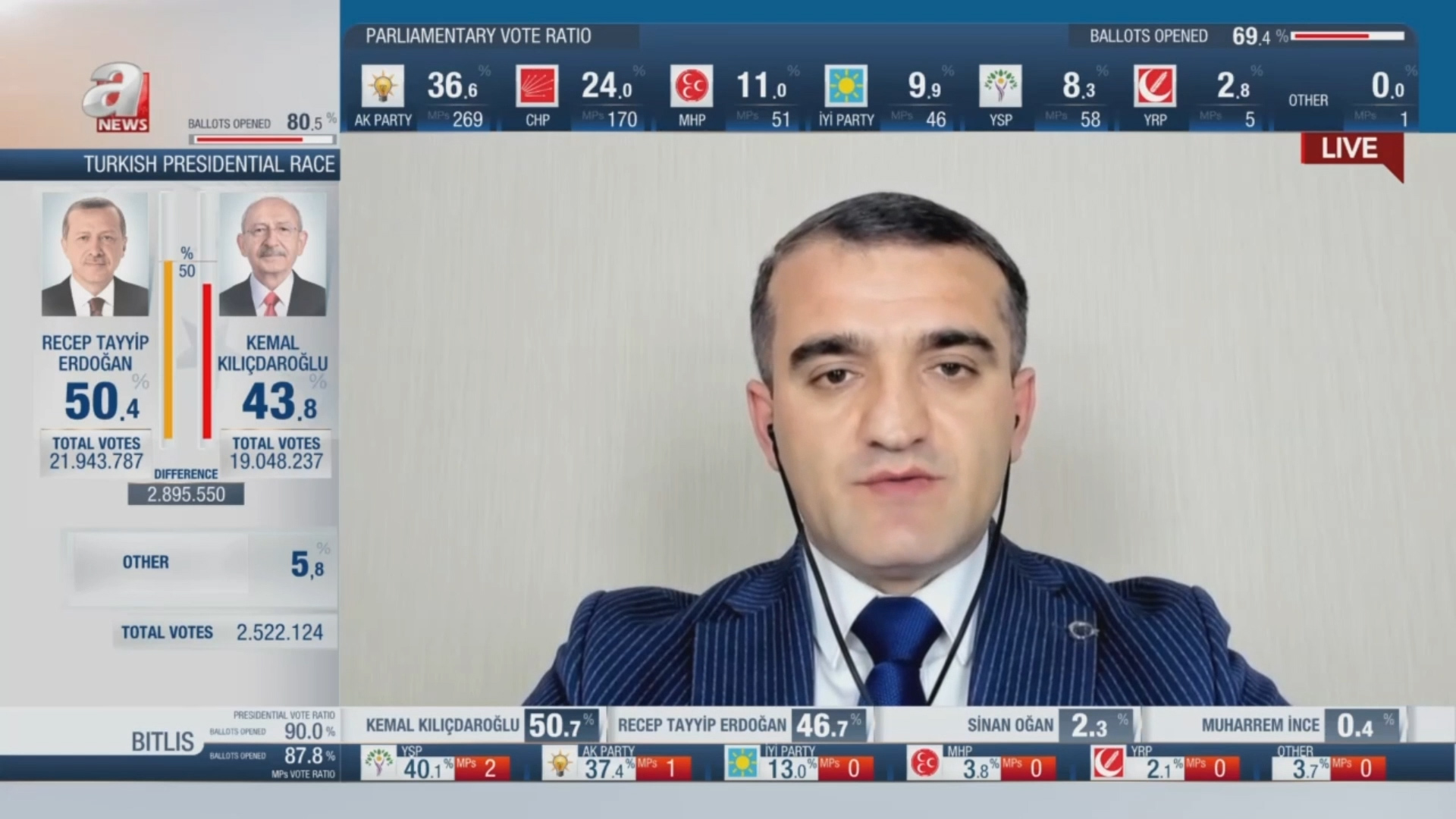 ANews kanalına bugünkü seçimlerle ilgili konuşan siyaset bilimci Dr. Ahmet Şairoğlu, Türkiye’nin demokrasi konusunda tüm dünyaya örnek olduğunu belirterek, “Türk milleti tercihini yapmıştır. Ön sonuçlara göre, Cumhur İttifakı ve onun adayı Recep Tayyip Erdoğan önde. Beklenen bir sonuç çünkü Erdoğan, Türkiye’yi son 20 yılda büyük ve güçlü bir ülke yaptı.”