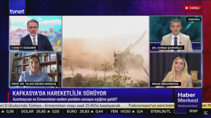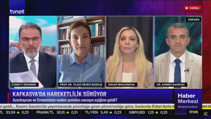 TVNET kanalının “Haber Merkezi” programında Azerbaycan ile Ermenistan arasındaki bu gerilim tartışıldı. Gazeteci Cüneyt Özdemir’in moderatörlüğü ile devam eden tartışmalarda Uluslararası İlişkiler Uzmanı Dr. Ahmet Şairoğlu, gazeteci Nigar İbrahimova ve Ankara Üniversitesi öğretim üyesi Prof. Dr. Yıldız Deveci Bozkuş yeni savaş olasılığını ele aldı.