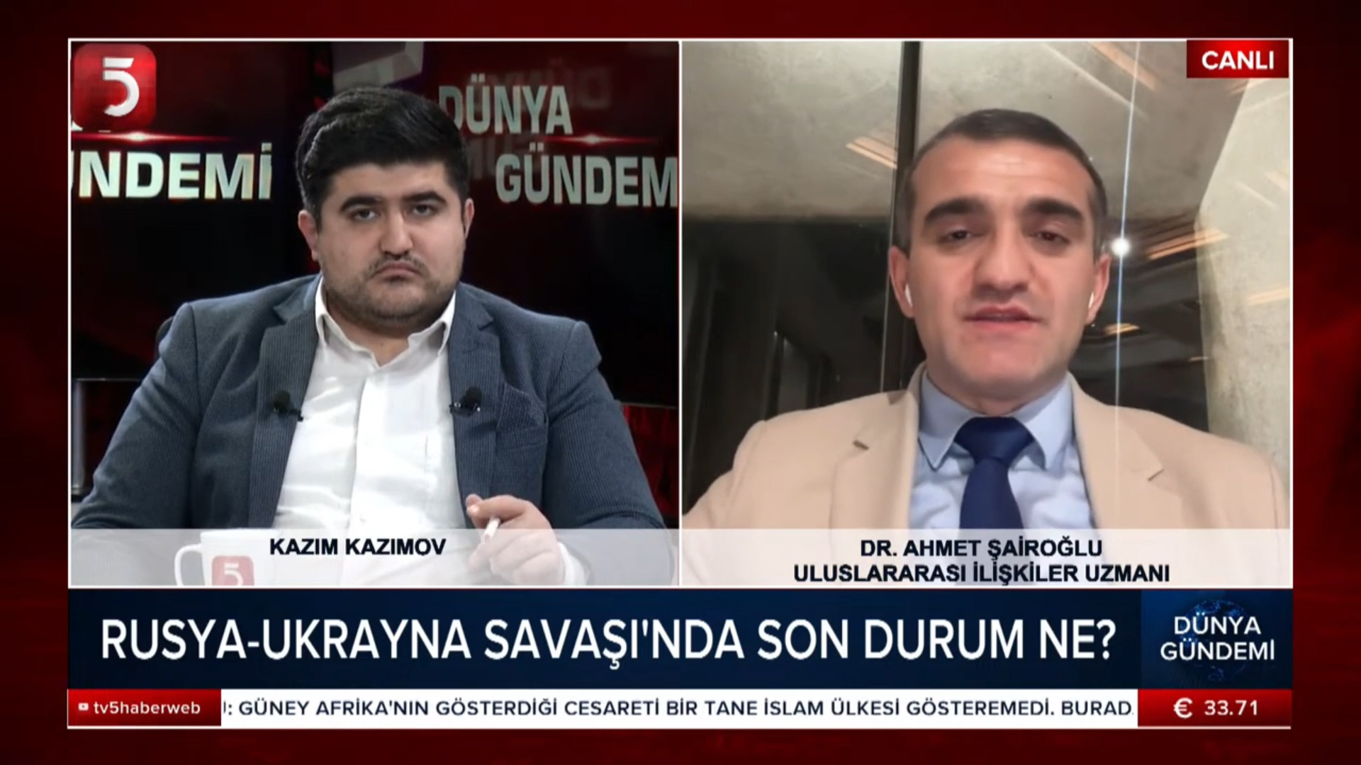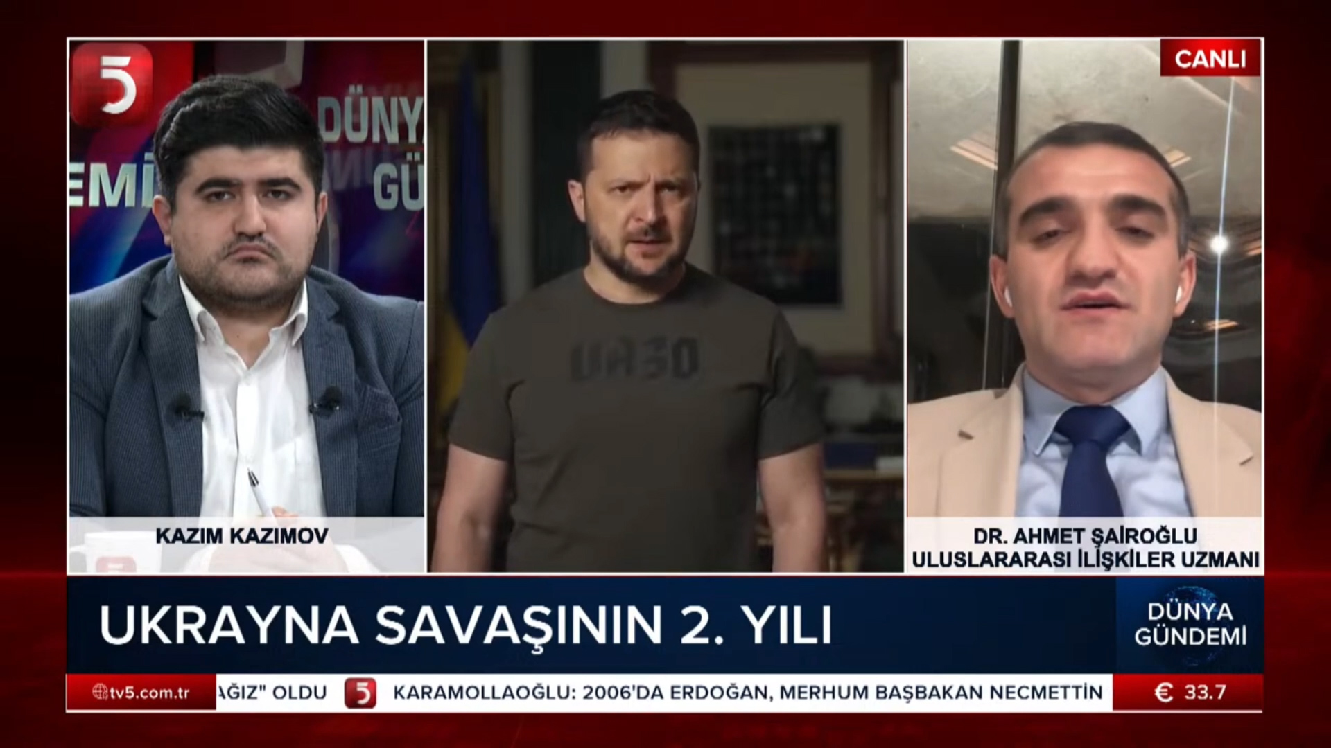 TV5 Televizyonu’na konuyla ilgili kapsamlı bir röportaj veren siyaset bilimci Dr. Ahmet Şairoğlu, Batı’nın Ukrayna-Rusya savaşına ilişkin planlarını yorumladı ve gazeteci Kazım Kazimov’un sorularını yanıtladı.