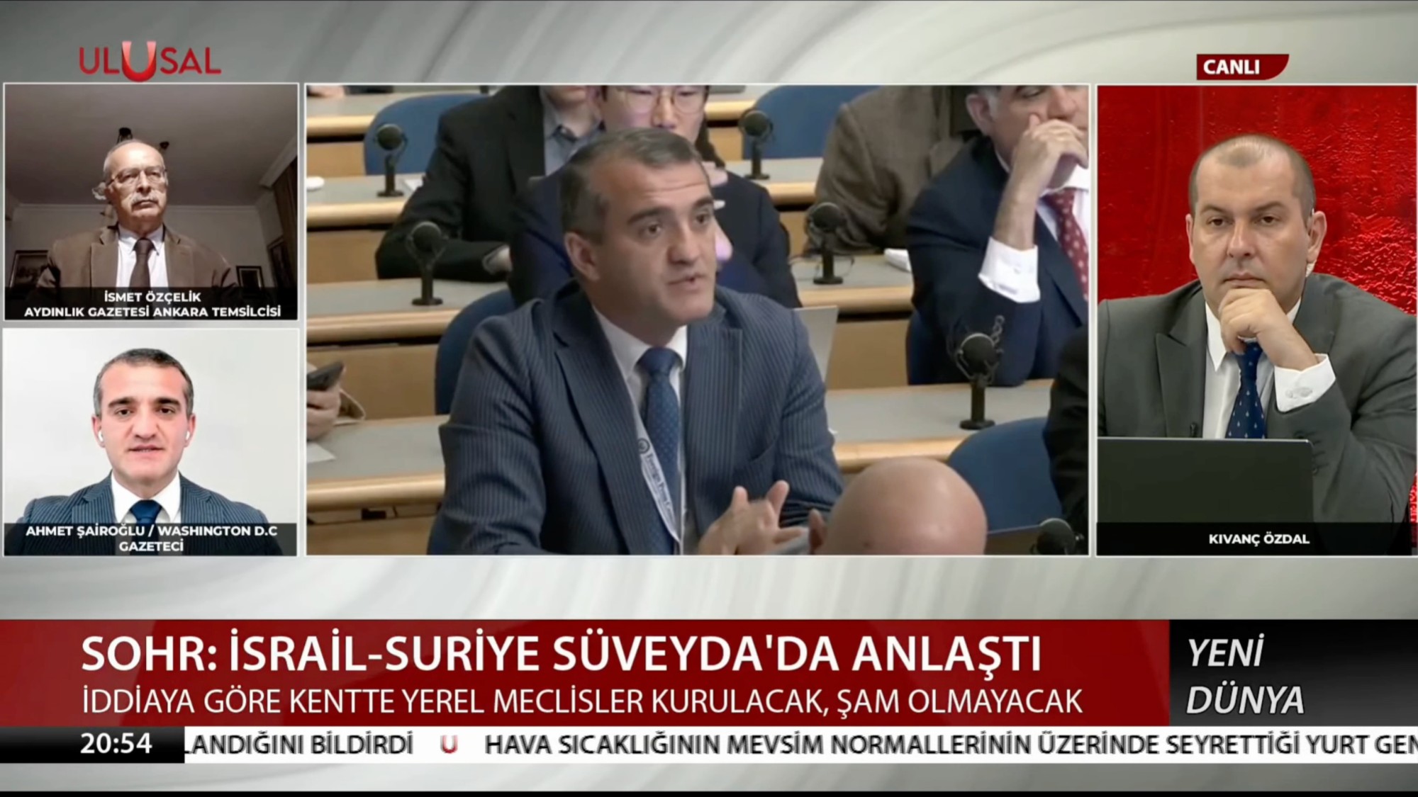 Gazeteci Kıvanç Özdal’ın sunduğu programa, “Aydınlık” gazetesi Ankara temsilcisi İsmet Özçelik ve uluslararası ilişkiler uzmanı Dr. Ahmet Şairoğlu konuk olarak katıldı.