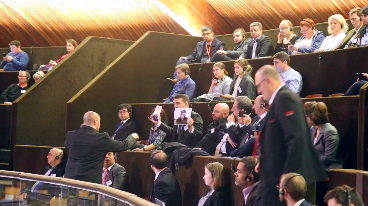 Ermənistan prezidenti Serj Sarkisyan AŞPA-ya daxil olarkən həmin stendin qarşısından keçib və plenar iclasların keçirildiyi zala daxil olub. Ermənistan prezidenti öz çıxışında ölkəsinin “inkişafı, demokratik dəyərlərə sadiqliyi və insan haqları” barədə ağızdolusu danışıb. Dağlıq Qarabağ münaqişəsi barədə yalan və qərəzli fikirlər səsləndirən Serj Sarkisyan çıxışı zamanı çətin duruma düşüb. Belə ki, zalda əyləşən hüquq müdafiəçisi Əhməd Şahidov əlində girovlar Dilqəm Əsgərov və Şahbaz Quliyevin fotolarını tutaraq, səssiz etiraz aksiyası keçirib. Serj Sarkisyan azərbaycanlı girovların fotolarını görüncə təəccüb edib və çıxışına bir müddət ara verməli olub. Səssiz aksiya AŞPA üzvlərinin də diqqətini çəkib. Bir müddətdən sonra AŞPA-nın Təhlükəsizlik Xidmətinin əməkdaşları zala daxil olub və Əhməd Şahidovdan aksiyanı dayandırmasını və zalı tərk etməsini tələb ediblər. Səssiz aksiya AŞPA üzvlərinin və sessiya iştirakçılarının azərbaycanlı girovlar Dilqəm Əsgərov və Şahbaz Quliyev barədə məlumatlanmasına səbəb olub və məsələ AŞPA daxilində geniş müzakirələrə yol açıb.