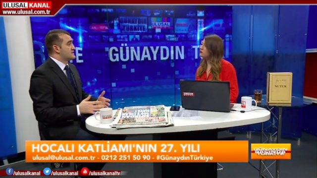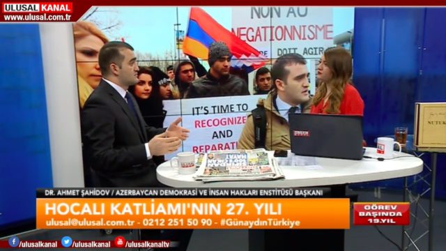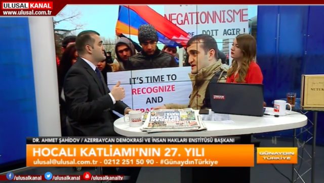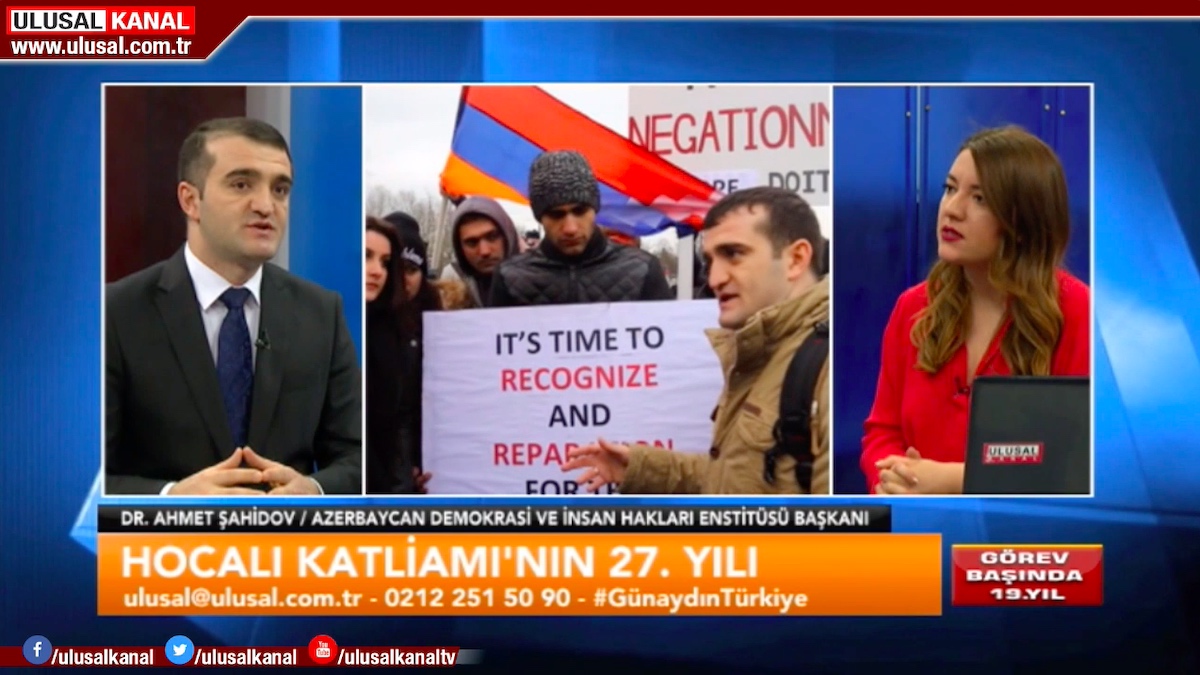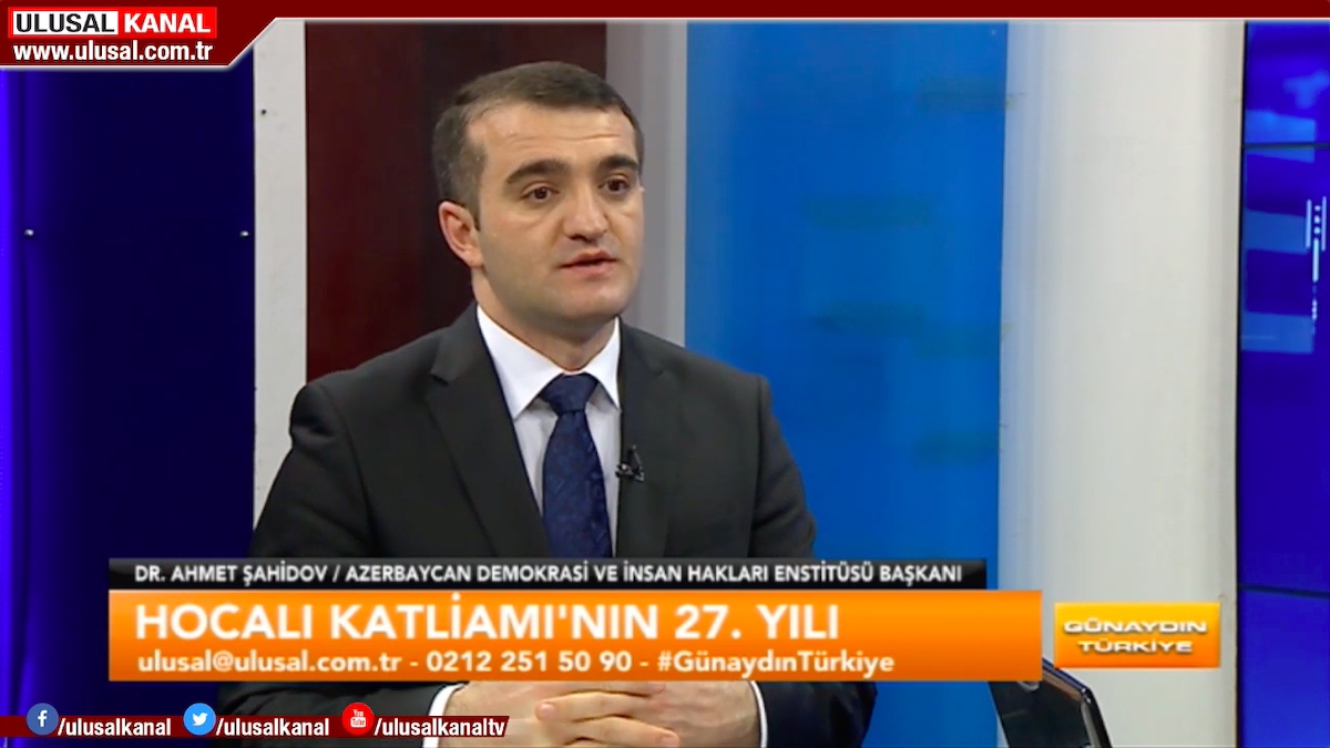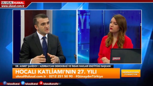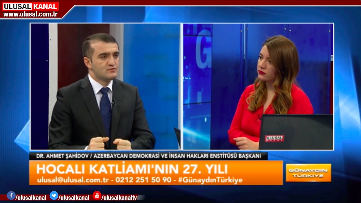 Türkiyədə işgüzar səfərdə olan Azərbaycan Demokratiya və İnsan Haqları İnstitutunun rəhbəri Əhməd Şahidov Fevralın 26-da Ulusal Kanal Televiziyasının canlı yayımında qonaq olub. “Günaydın Türkiyə” proqramının aparıcısı Seda Anıkın suallarını cavablandıran hüquq müdafiəçisi Xocalı soyqırımının 27-ci ildönümü barədə məlumat verib, erməni vəhşiliklərindən söz açıb və dünya ictimaiyyətinin bu soyqırıma yetərli hüquqi və siyasi qiymət vermədiyini bildirib.