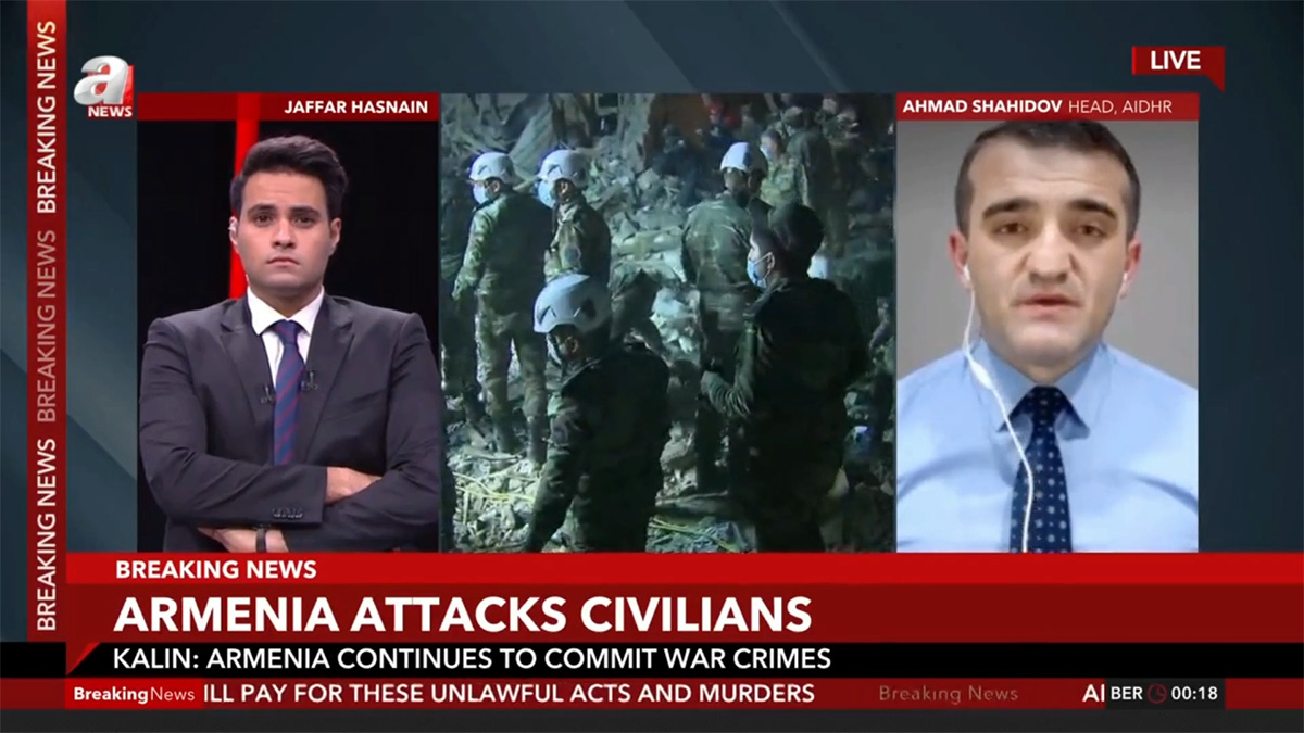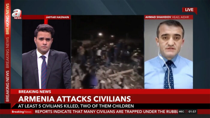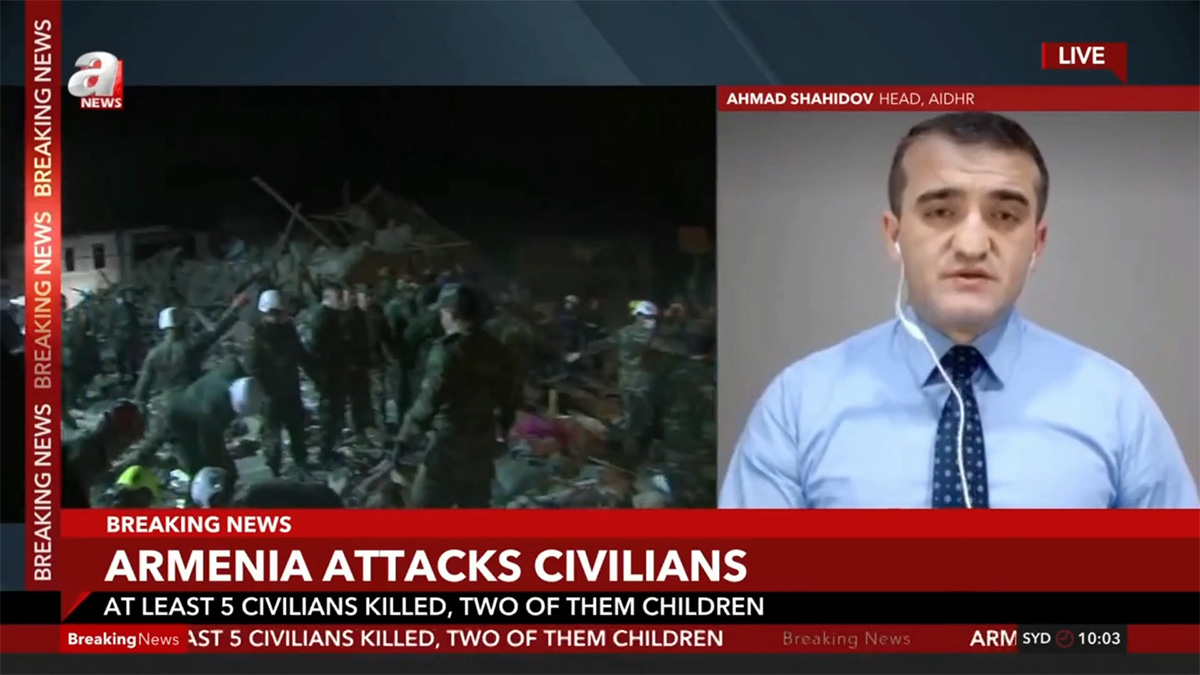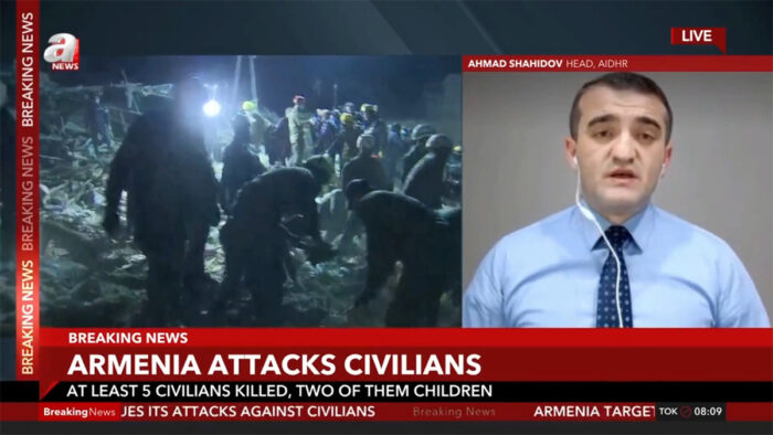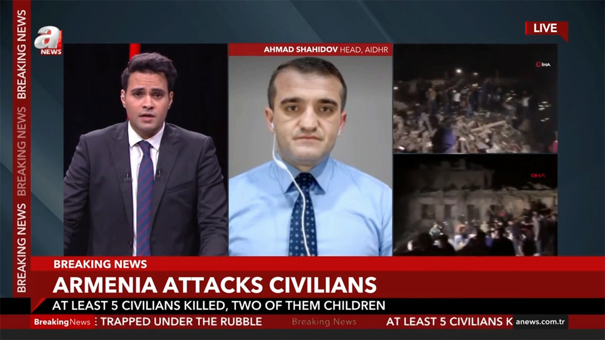 ANews kanalına müsahibə verən Azərbaycan Demokratiya və İnsan Haqları İnstitutunun rəhbəri, hüquq müdafiəçisi Əhməd Şahidov bildirib ki, Ermənistan silahlı birləşmələri bugün Mingəçevir şəhərinə də raket zərbələri endiriblər. Bu hücumlar nəticəsində ən azı 47 nəfər həlak olub və 222 nəfər ağır yaralanıb, – Əhməd Şahidov əlavə edib.