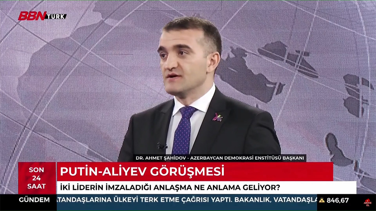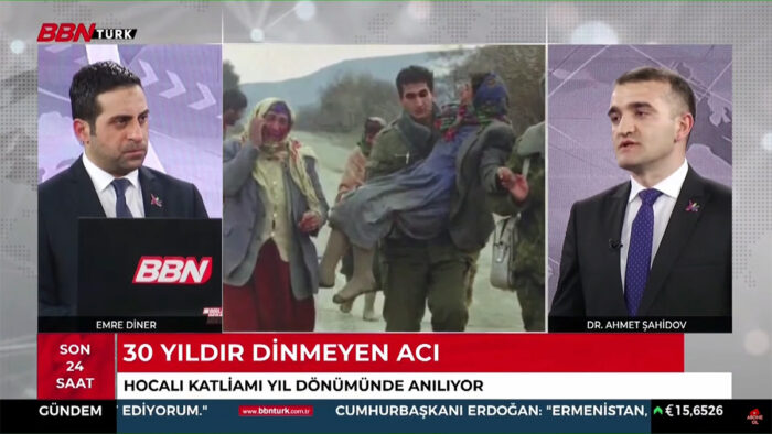 Türkiyədə səfərdə olan Azərbaycan Demokratiya və İnsan Haqları İnstitutunun rəhbəri Əhməd Şahidov BBN Türk Televiziyasının “Son 24 Saat” proqramının qonağı olub. Aparıcı Emre Dinerin suallarını cavablandıran Əhməd Şahidov Xocalı soyqırımının 30-cu ildönümü, Ukrayna böhranı və Azərbaycan-Rusiya münasibətlərindən danışıb.