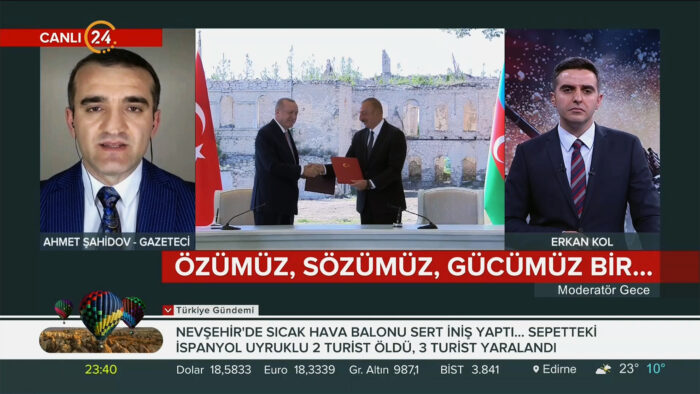 Kanal24 Televiziyasının “Moderator Gecə” proqramında çıxış edən Türkiyə Demokratiya və İnsan Haqları İnstitutunun rəhbəri Əhməd Şahidov Azərbaycanın Müstəqillik Günü və Türkiyə-Azərbaycan münasibətlərindən danışıb, jurnalist Erkan Kol`un suallarını cavablandırıb.