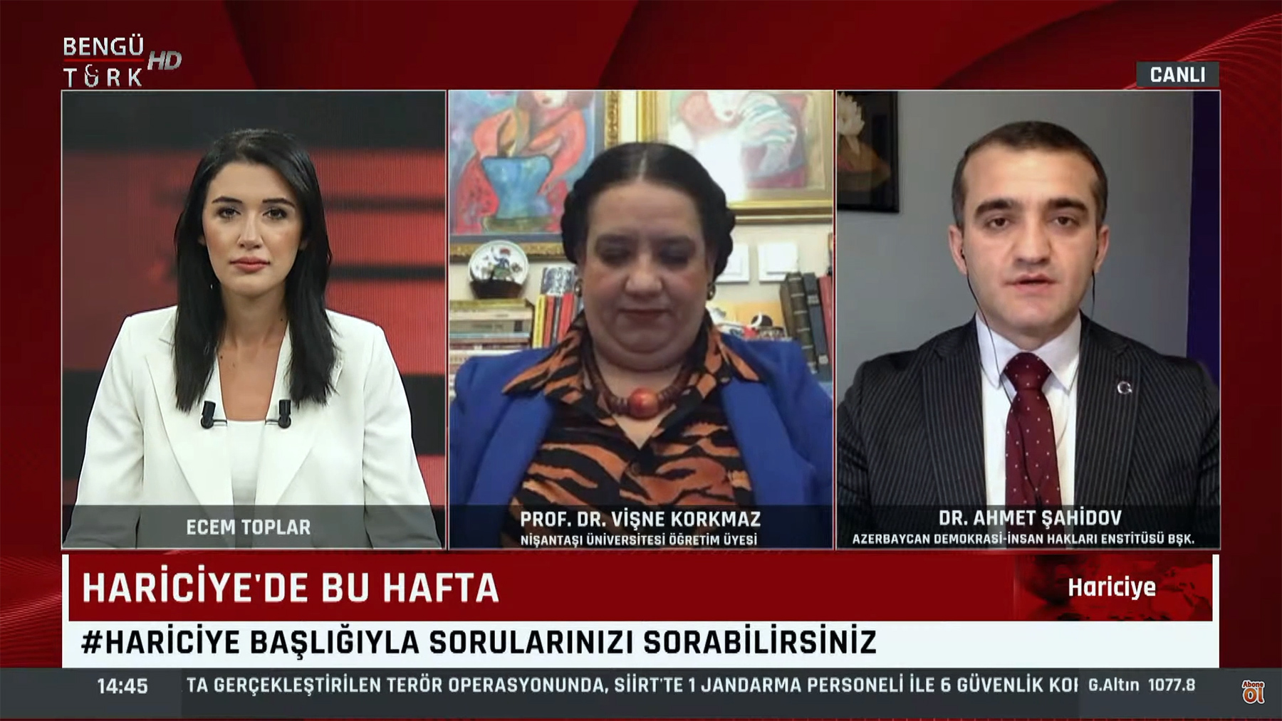 Jurnalist Ecem Topların qonaqları siyasi şərhçi Dr. Əhməd Şahidov və Nişantaşı Universitetinin professoru Prof. Dr. Vişne Qorxmaz oldu.