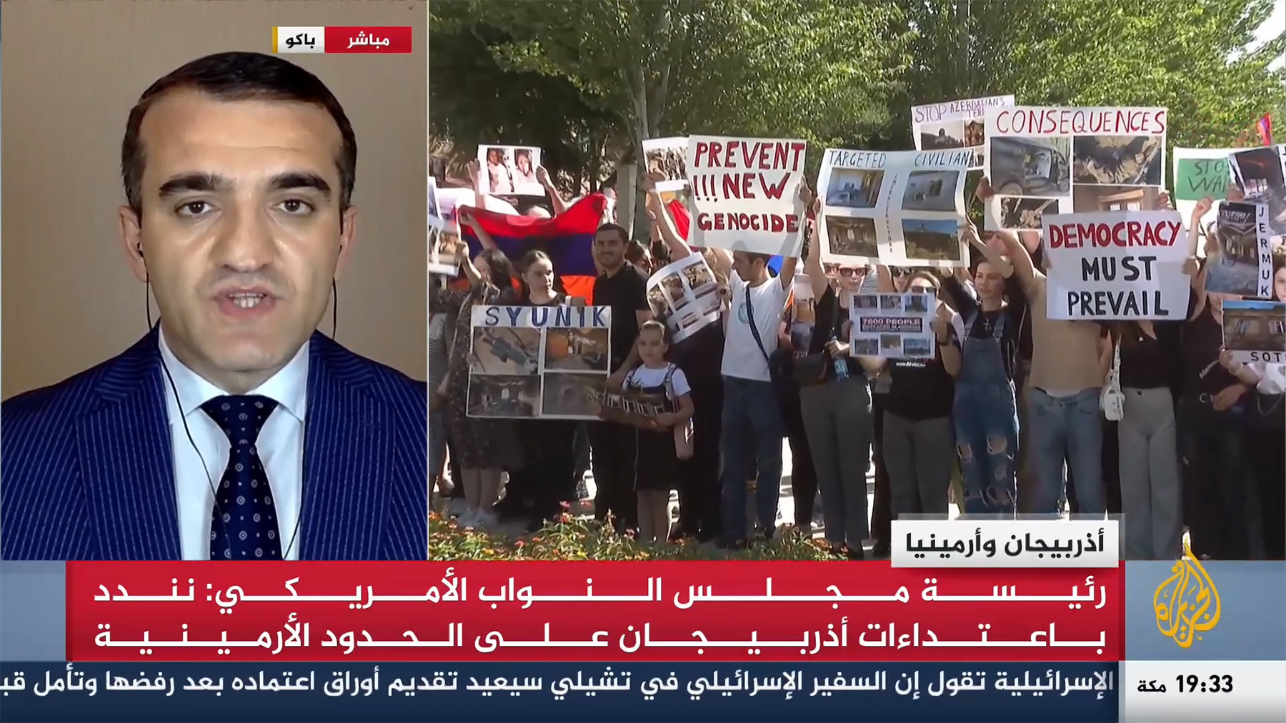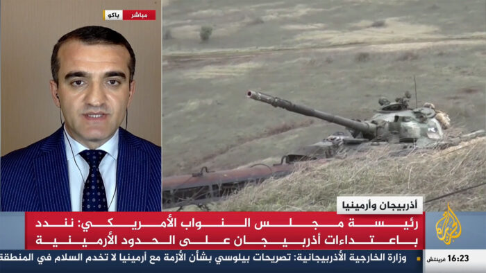 Bölgədəki son vəziyyətlə bağlı daha bir canlı müzakirə nüfuzlu “Əl-Cəzirə” kanalında baş tutub. Ermənistan və Azərbaycan nümayəndələri gərgin müzakirədə üz-üzə gəliblər. Tanınmış erməni ekspert Sako Arian və azərbaycanlı hüquq müdafiəçisi Əhməd Şahidov Ermənistan-Azərbaycan dövlət sərhədindəki son hərbi əməliyyatlar, ABŞ Konqresinin Nümayəndələr Palatasının sədri Nensi Pelosinin İrəvana səfəri və Azərbaycanın xarici ölkələrdəki səfirliklərinə edilən hücumlarla bağlı fikirlərini bölüşüblər.