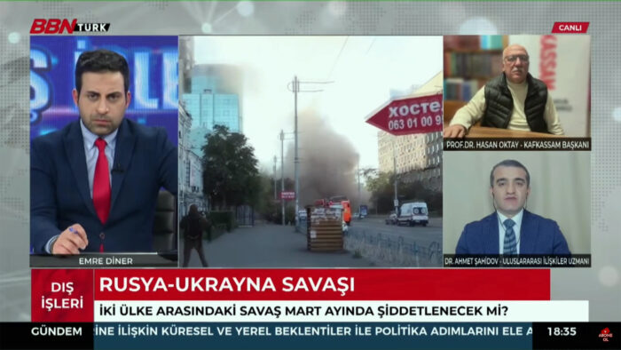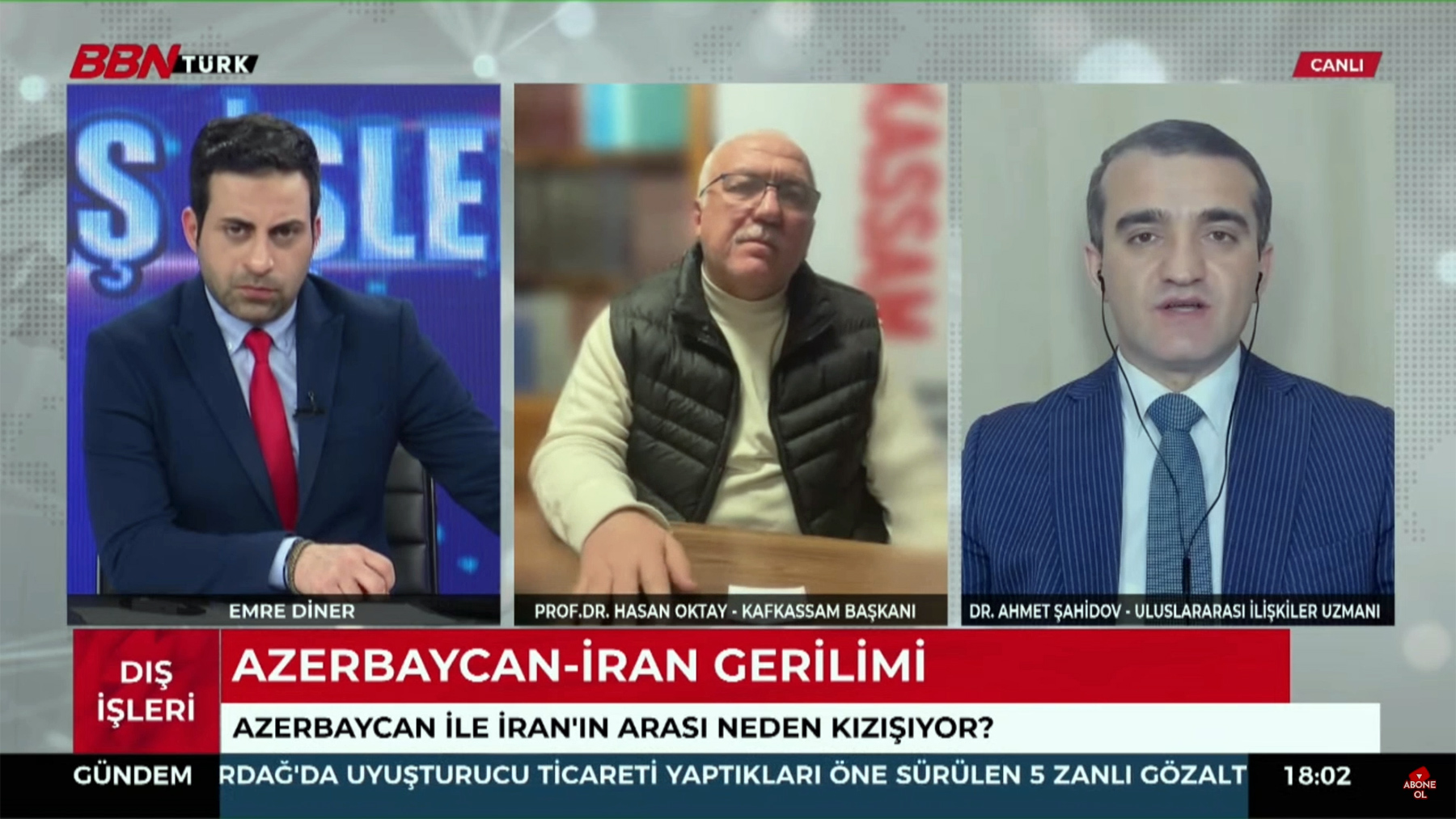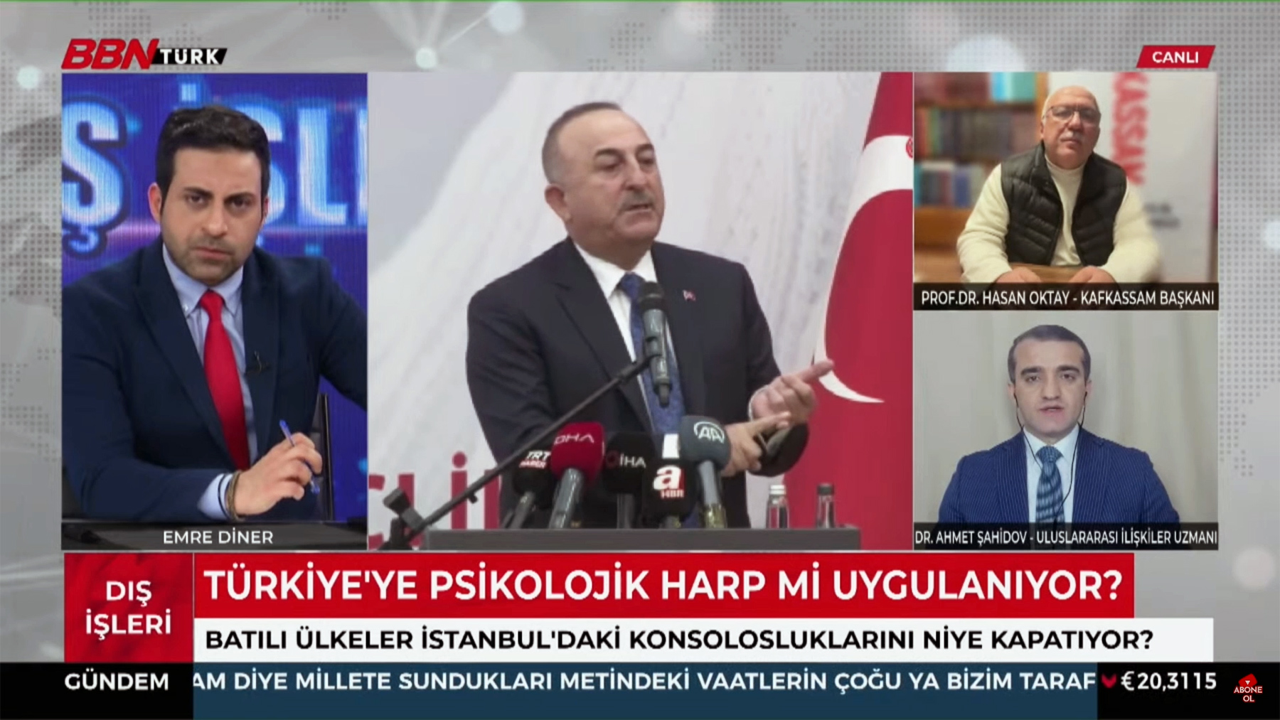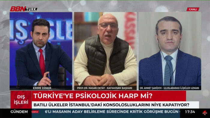 BBNTürk kanalında yayımlanan “Xarici işlər” proqramında Türkiyə və dünya gündəmi müzakirə edildi. Aparıcı Emre Diner`in suallarını KAFKASSAM başkanı Hasan Oktay və siyasi şərhçi Əhməd Şahidov cavablandırıb.