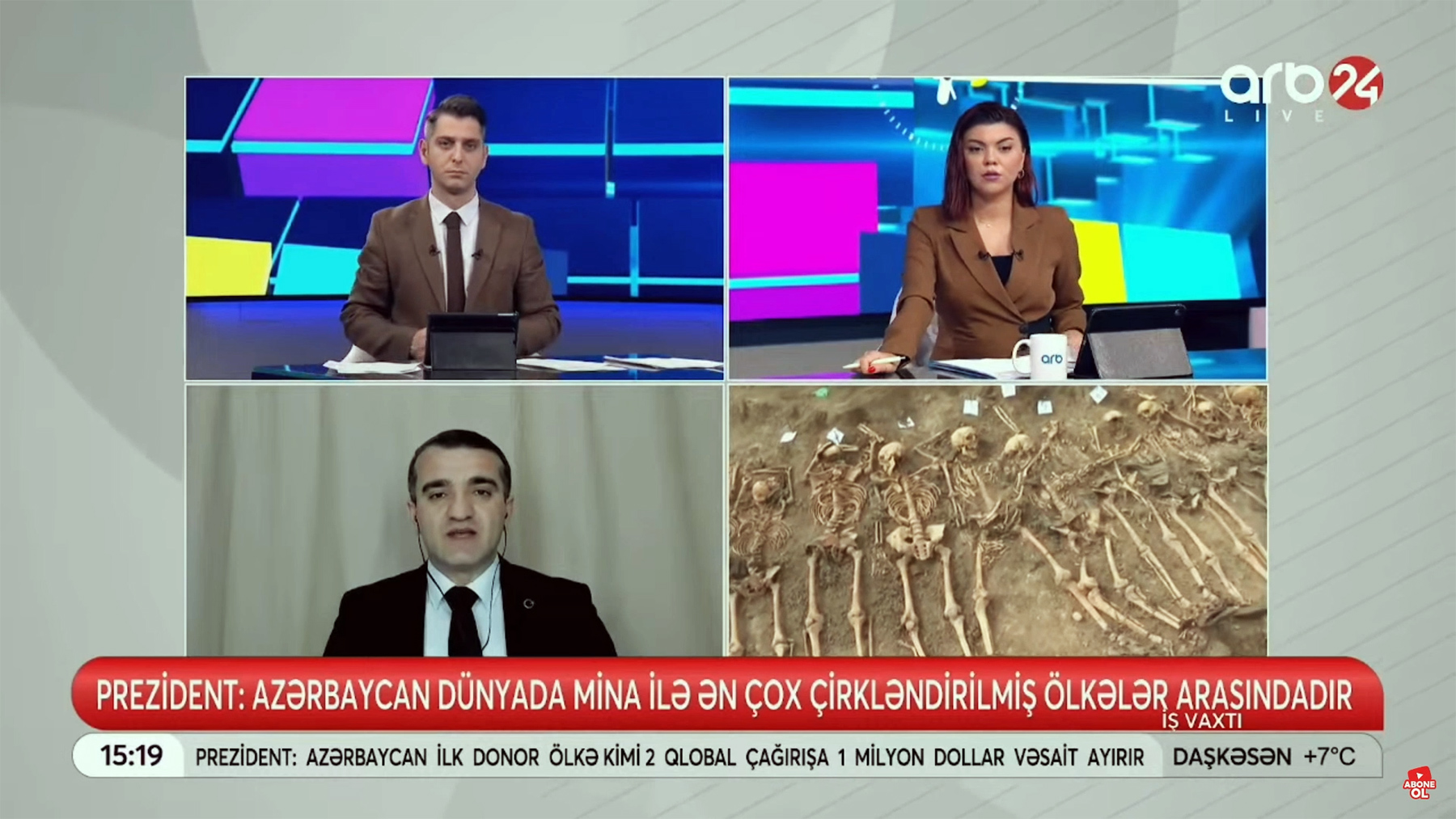 Mövzu ilə bağlı ARB24 Televiziyasının “İş Vaxtı” proqramında çıxış edən hüquq müdafiəşçisi Əhməd Şahidov Ermənistanın törətdiyi müharibə cinayətləri – ərazilərin minalardan təmizlənməsi və işğaldan azad edilən ərazilərdə azərbaycanlılara məxsus insan skeleti qalıqları ilə bağlı danışıb.