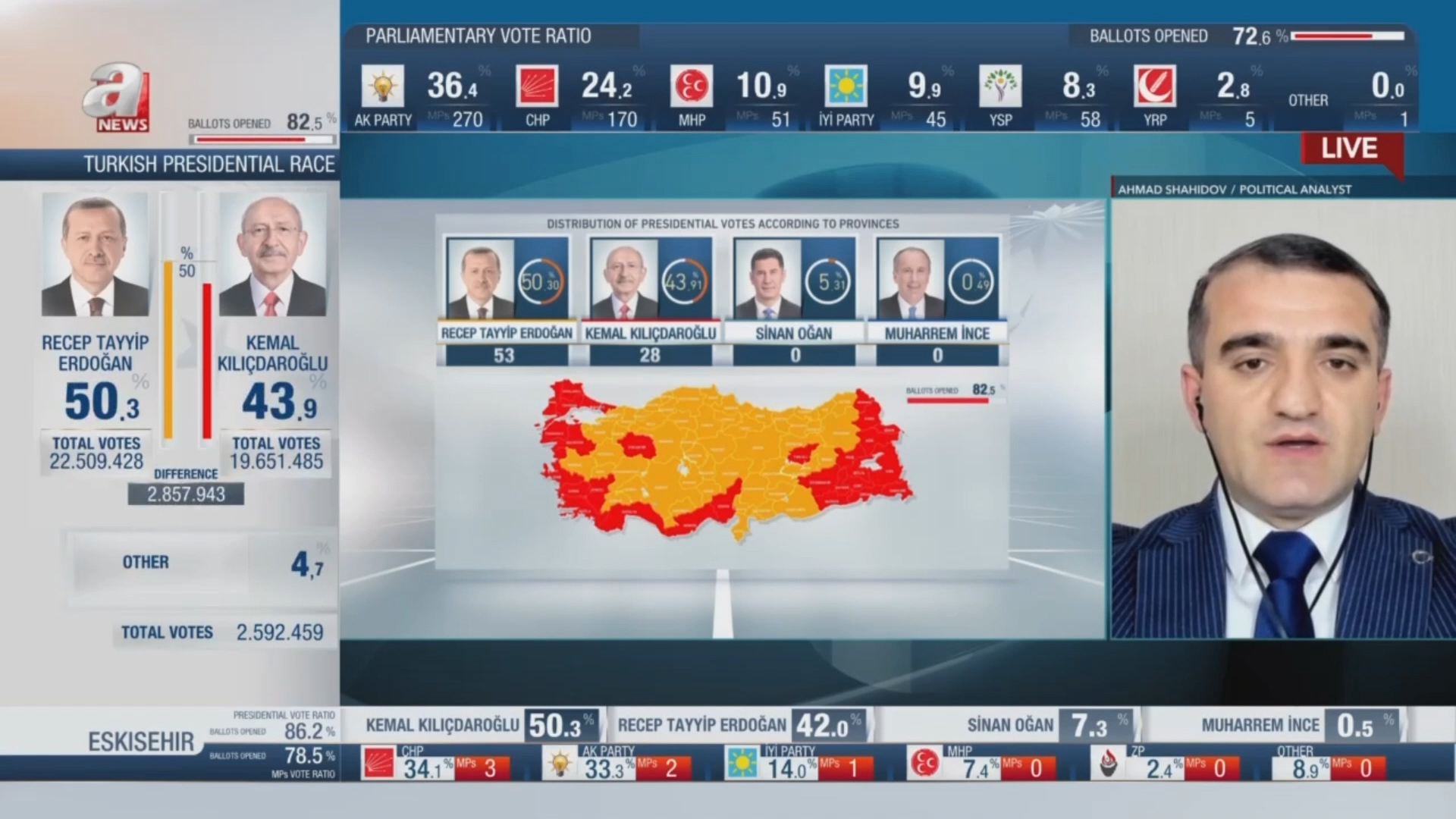 Bugünkü seçkilərlə bağlı ANews kanalına müsahibə verən siyasi şərhçi Əhməd Şahidov Türkiyənin bütün dünyaya demokratya nümunəsi göstərdiyini deyib: “Türk Milləti öz seçimini etdi. İlkin nəticələrə görə, Cumhur İttifaqı və onun namizədi Recep Tayyip Erdoğan irəlidədir. Gözlənilən nəticədir. Çünki Erdoğan son 20 ildə Türkiyəni böyük inkişaf yolu ilə aparıb. Türkiyədəki seçkilər bütün dünyada yaxından izlənilir. Bugün Türkiyə bütün dünyaya demokratiya nümunəsi göstərdi”.