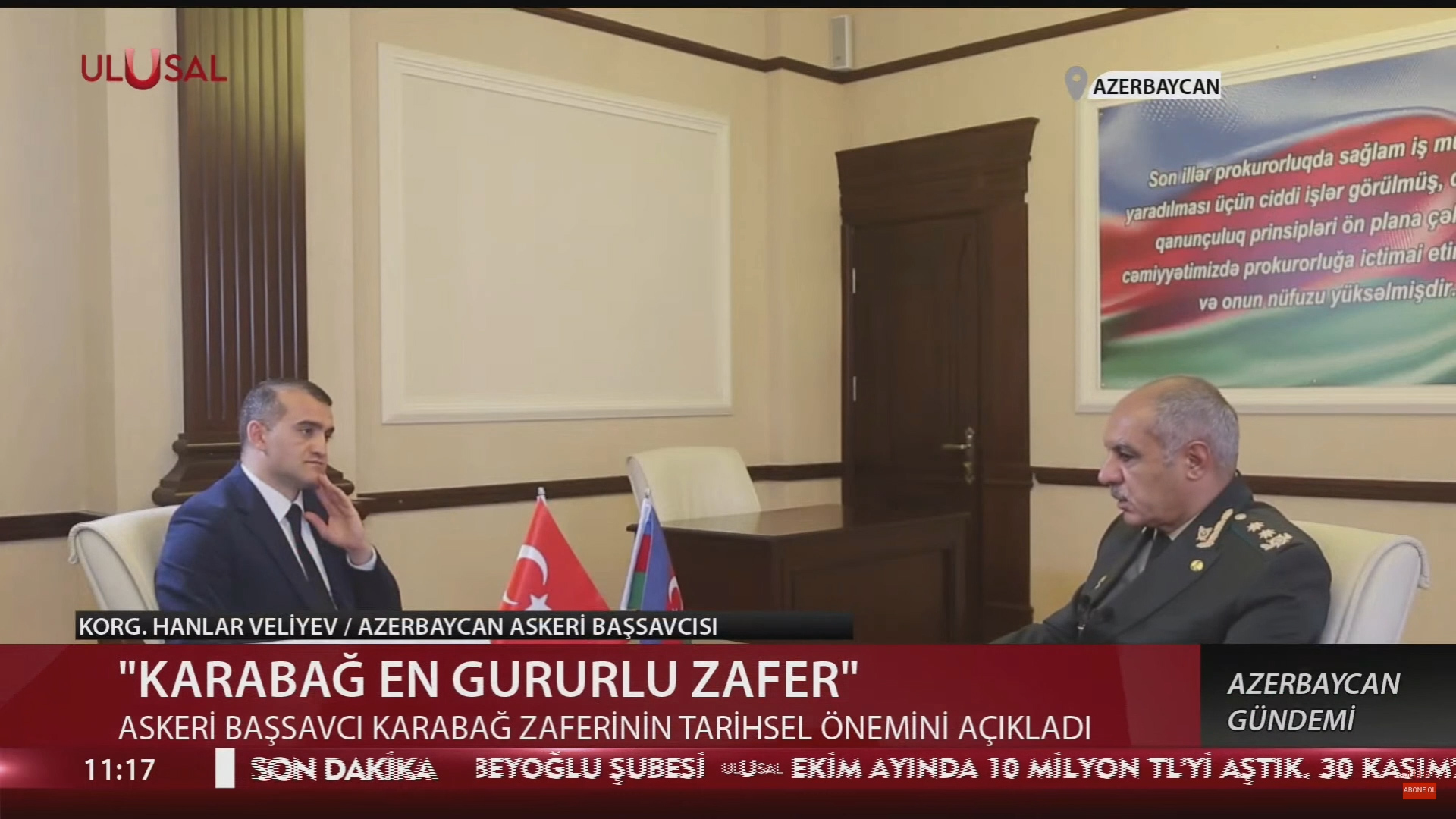 8 Noyabr Zəfər Günü münasibətilə Azərbaycanın Hərbi Prokuroru, general-leytenant Xanlar Vəliyev Türkiyənin Ulusal Kanal Televiziyasına özəl müsahibə verib və Əhməd Şahidovun suallarını cavablandırıb. Respublikanın Hərbi Prokuroru 8 Noyabr Zəfər Bayramı ilə bağlı fikirlərini bölüşüb, bu tarixi qələbənin qazanılmasında Azərbaycan-Türkiyə qardaşlığının roluna diqqət çəkib. Ömrünün son 20 ilini Azərbaycanın Hərbi Prokuroru vəzifəsində çalışmış, Azərbaycan xalqına qarşı törədilmiş hərbi cinayətlərin araşdırılmasında və erməni terrorizminin ifşasında böyük xidmətləri olan general Xanlar Vəliyev Türk Birliyinin gücünə diqqət çəkib və getdikcə güclənən Türk Dövlətləri Təşkilatının həm siyasi, həm də hərbi sahədə əməkdaşlığı gücləndirəcəyini bildirib.
