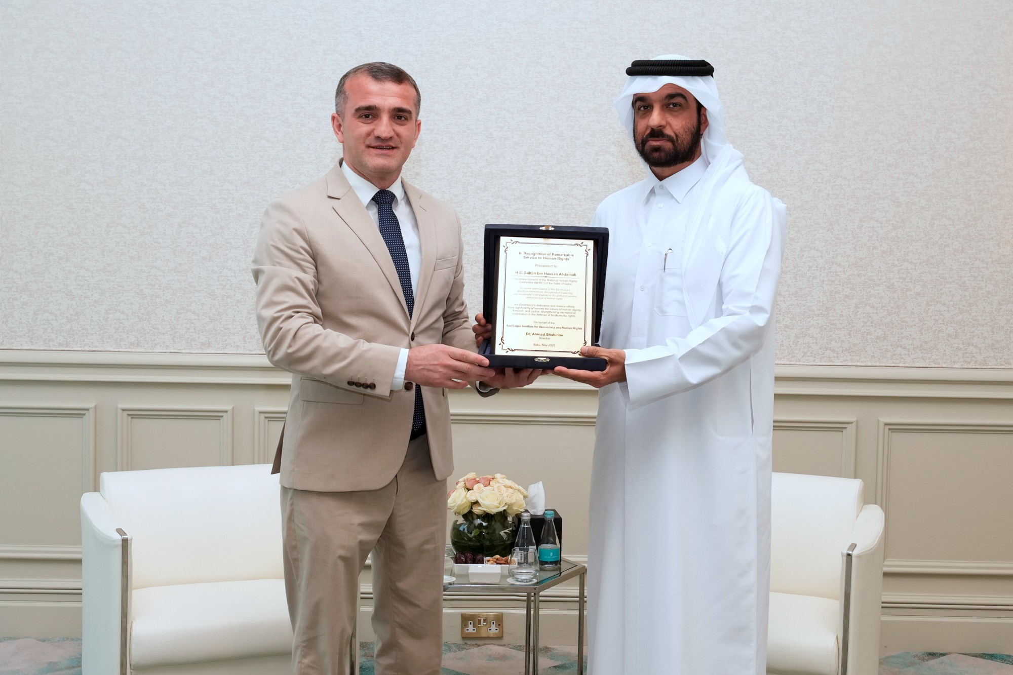 27-28 may 2025-ci il tarixlərində Qətərin paytaxtı Dohada keçirilən “Süni İntellekt və İnsan Hüquqları: İmkanlar, Risklər və Daha Yaxşı Gələcək Naminə Baxış” adlı beynəlxalq konfrans çərçivəsində hüquq müdafiəçisi, Azərbaycan Demokratiya və İnsan Haqları İnstitutunun rəhbəri Əhməd Şahidov Qətər Milli İnsan Haqları Komitəsinin baş katibi Sultan bin Həsən Əl Jamali ilə görüşüb.