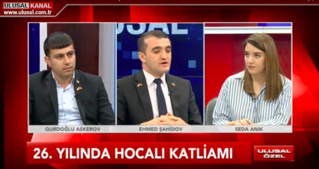 Türkiyədə işgüzar səfərdə olan Azərbaycan Demokratiya və İnsan Haqları İnstitutunun rəhbəri Əhməd Şahidov Fevralın 24-də Ulusal Kanal Televiziyasının canlı yayımında qonaq olub. “Ulusal Özel” proqramının aparıcısı Seda Anıkın suallarını cavablandıran hüquq müdafiəçisi Xocalı soyqırımının 26-cı ildönümü barədə məlumat verib, erməni vəhşiliklərindən söz açıb və dünya ictimaiyyətinin bu soyqırıma yetərli hüquqi və siyasi qiymət vermədiyini bildirib.