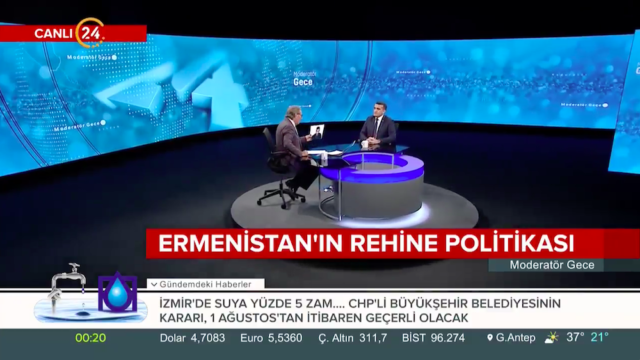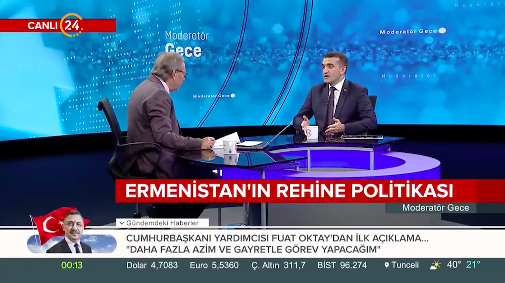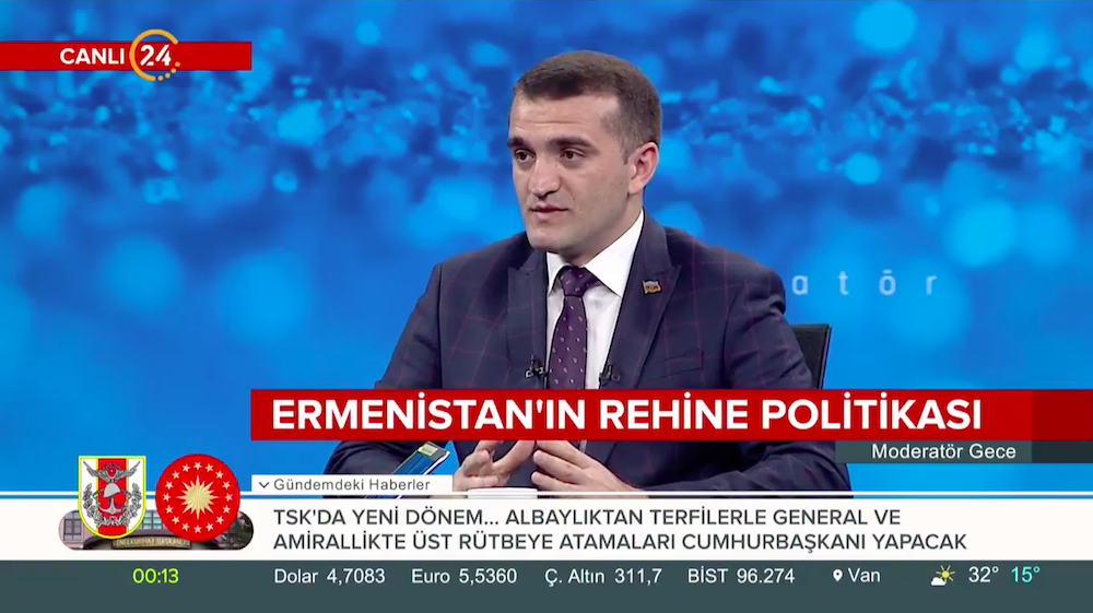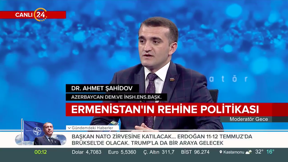 Türkiyədə işgüzar səfərdə olan Azərbaycan Demokratiya və İnsan Haqları İnstitutunun rəhbəri Əhməd Şahidov İyulun 10-da Kanal 24 Televiziyasının canlı yayımında qonaq olub. “Moderator Gecə” proqramının aparıcısı Ardan Zentürkün qonağı olan hüquq müdafiəçisi Azərbaycan gündəmini dəyərləndirib. Azərbaycan Ordusunun 100 illiyi barədə danışan Əhməd Şahidov Dağlıq Qarabağ münaqişəsi və işğal altında olan torpaqların azad edilməsi perspektivləri barədə danışıb. Azərbaycanlı girovlar Dilqəm Əsgərov və Şahbaz Quliyevin 4 ildir ki, erməni əsirliyində işgəncələrə məruz qaldığını diqqətə çatdıran hüquq müdafiəçisi Ermənistanın beynəlxalq çağırışlara məhəl qoymadığını bildirib.